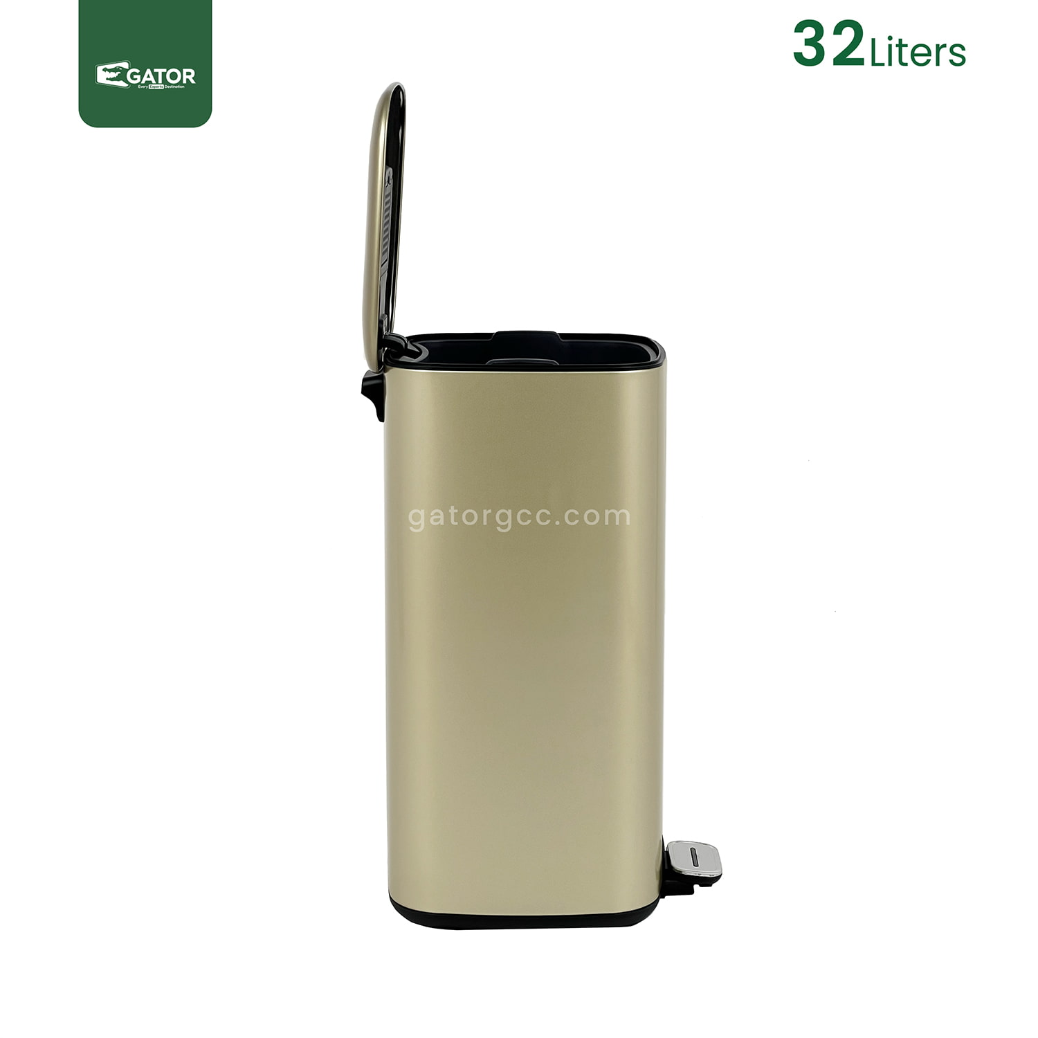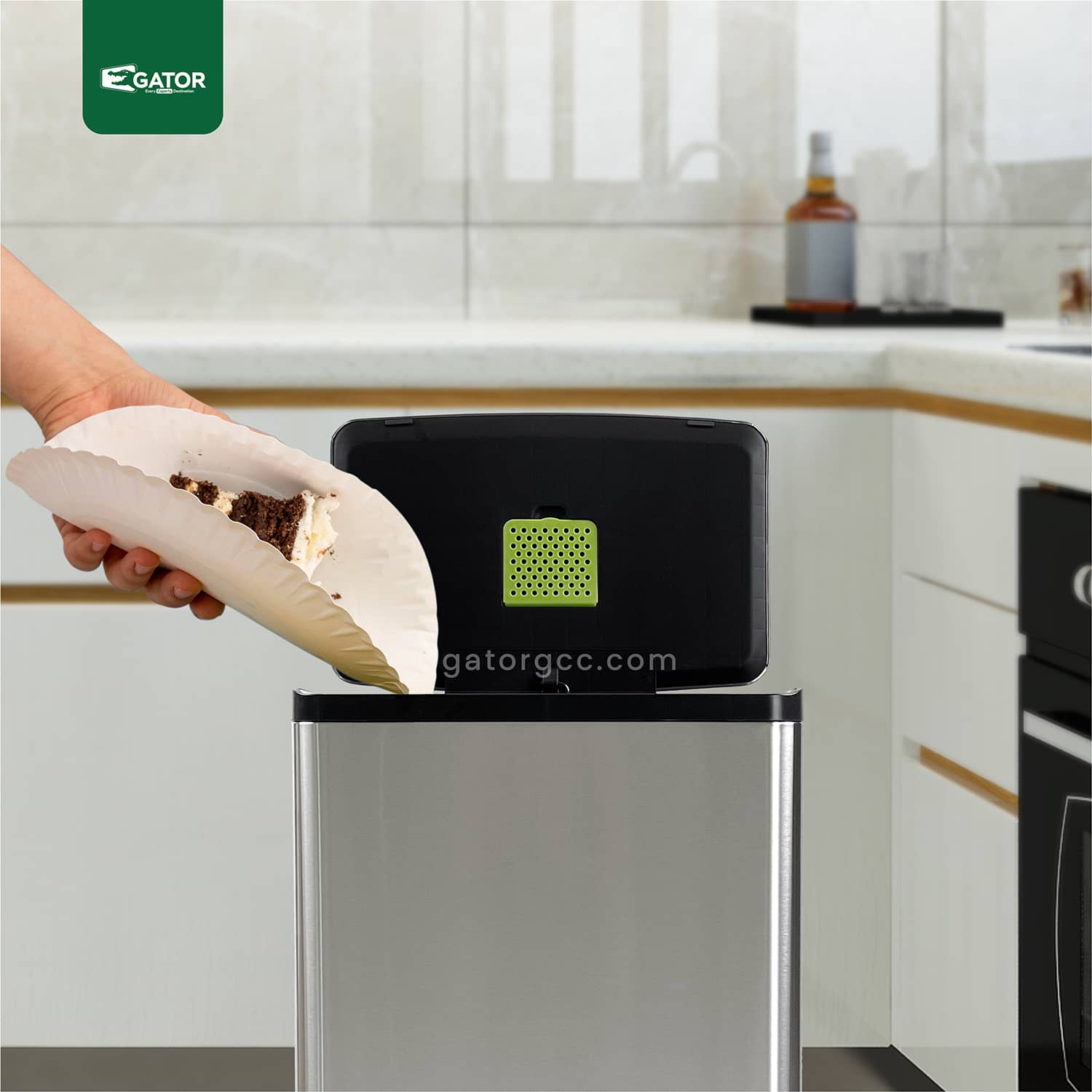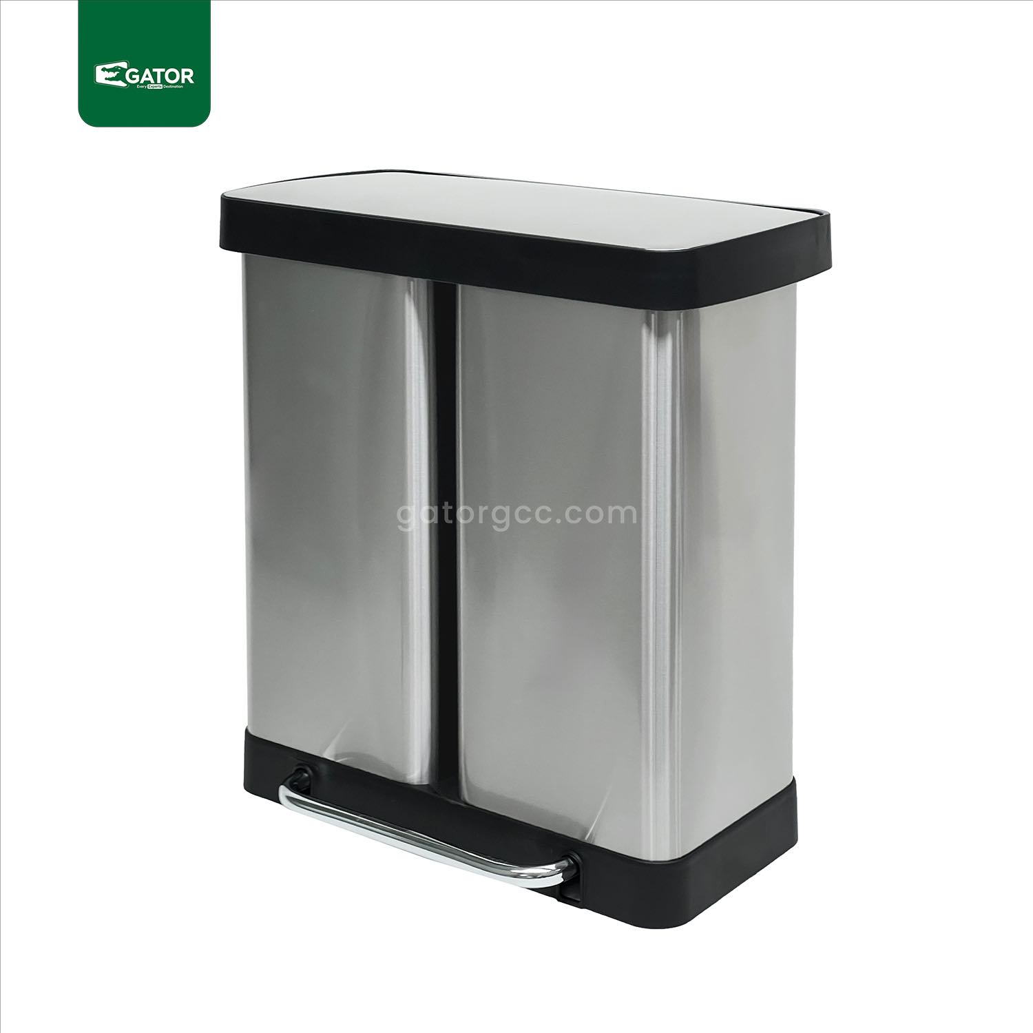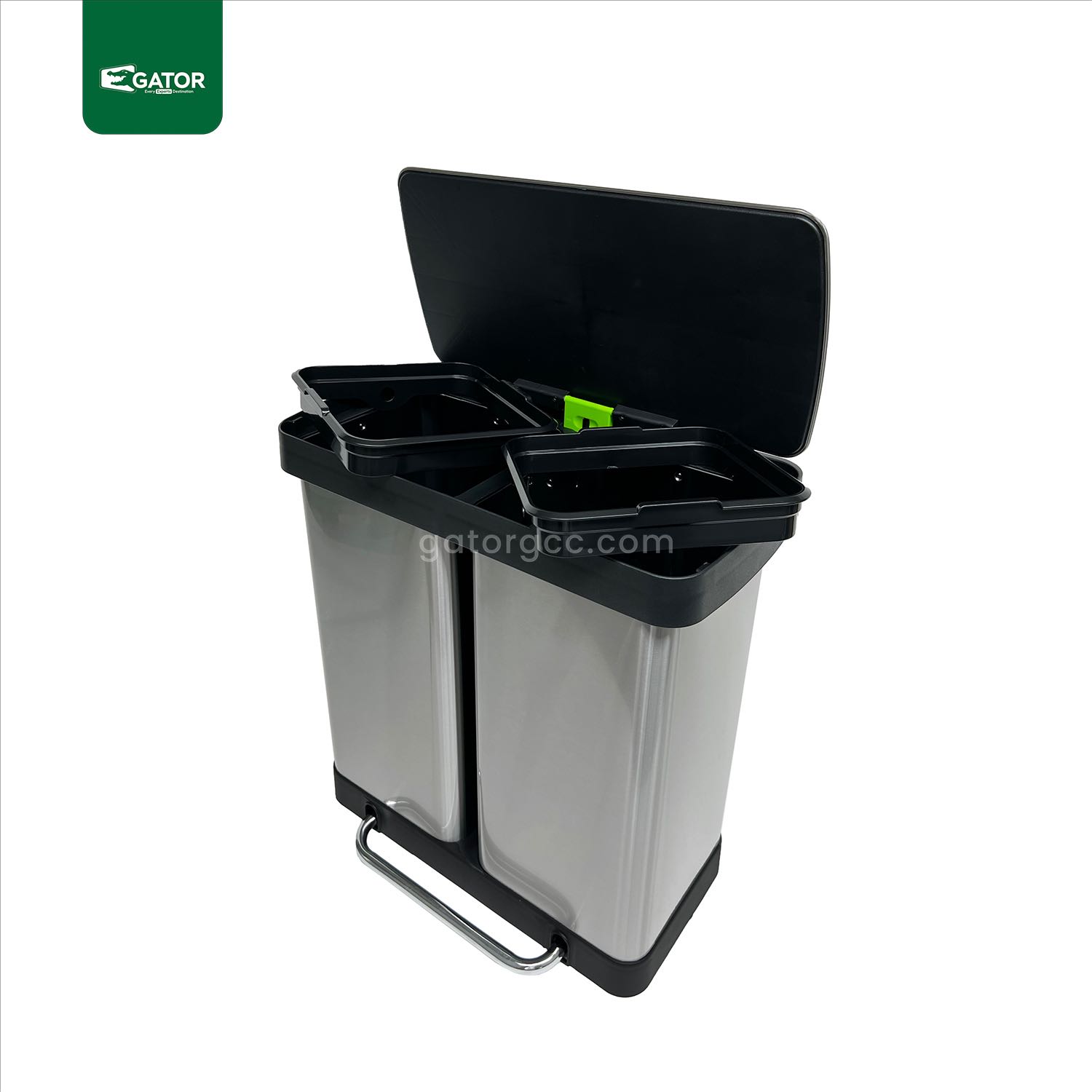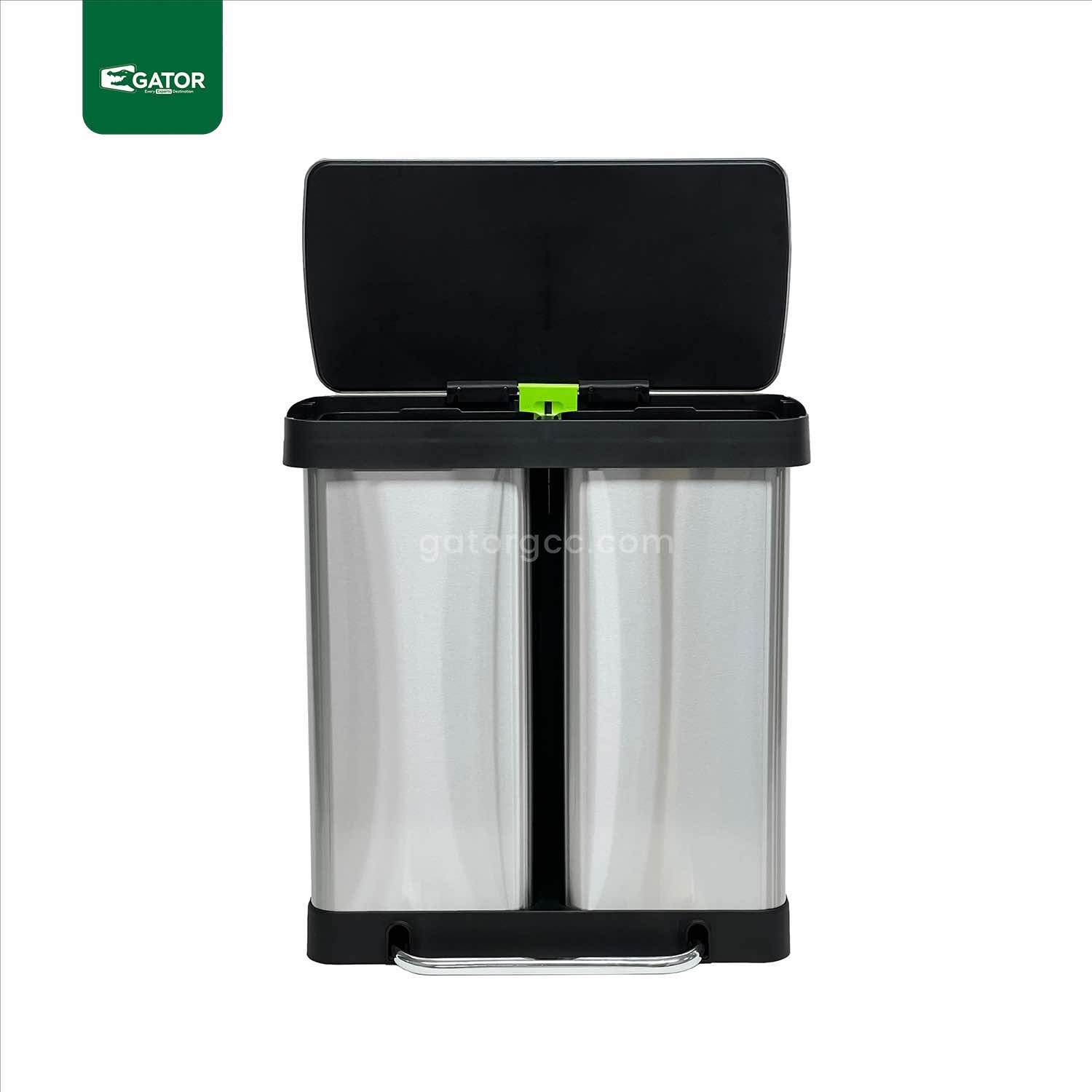SS34 – Dual-compartment stainless steel pedal trash bin, 72L total (2×35L), soft-close lid, central wide pedal, removable bag frame, fingerprint-resistant finish.