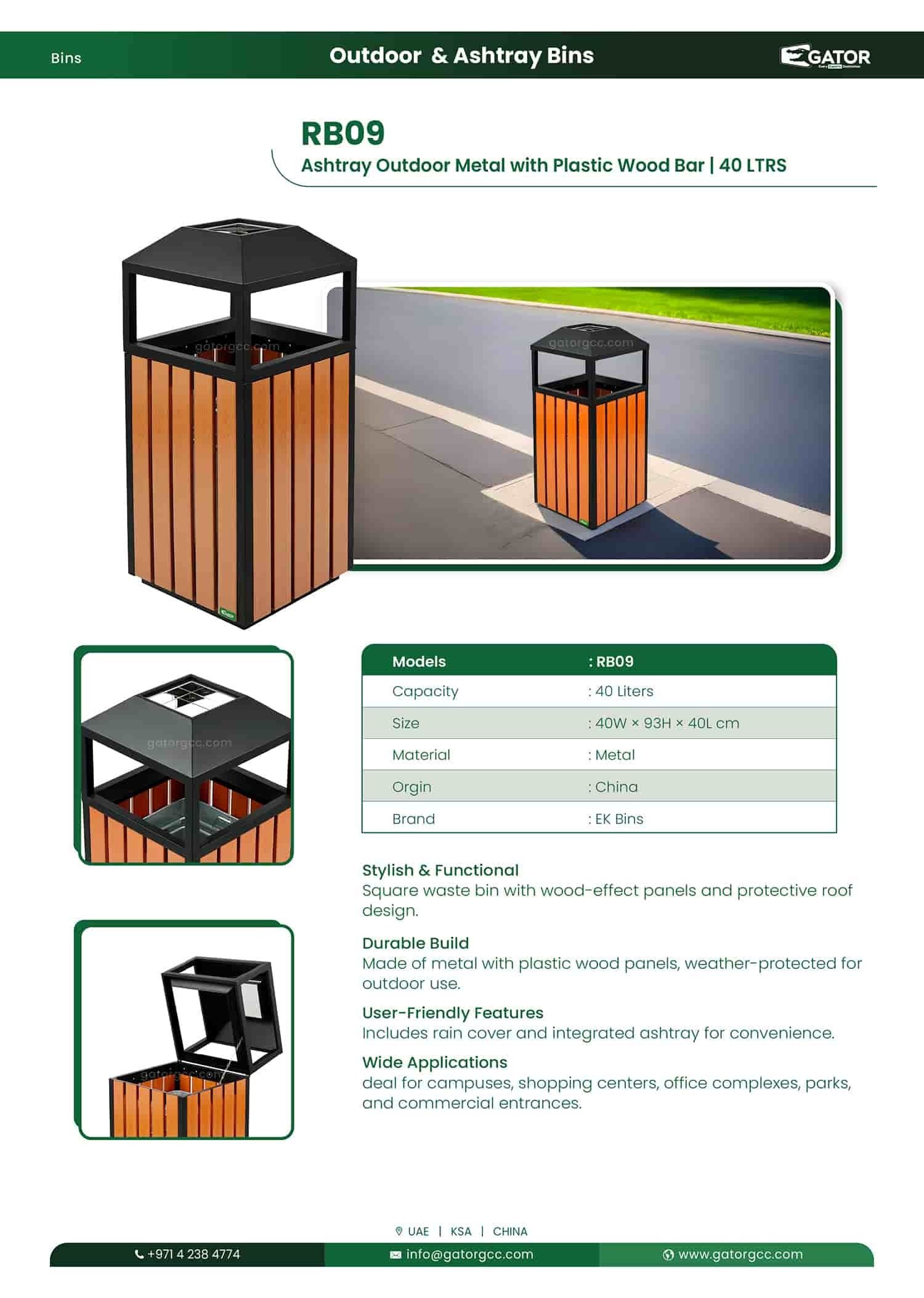 Ashtray Outdoor Metal with Plastic Wood Bar | 40 LTRS