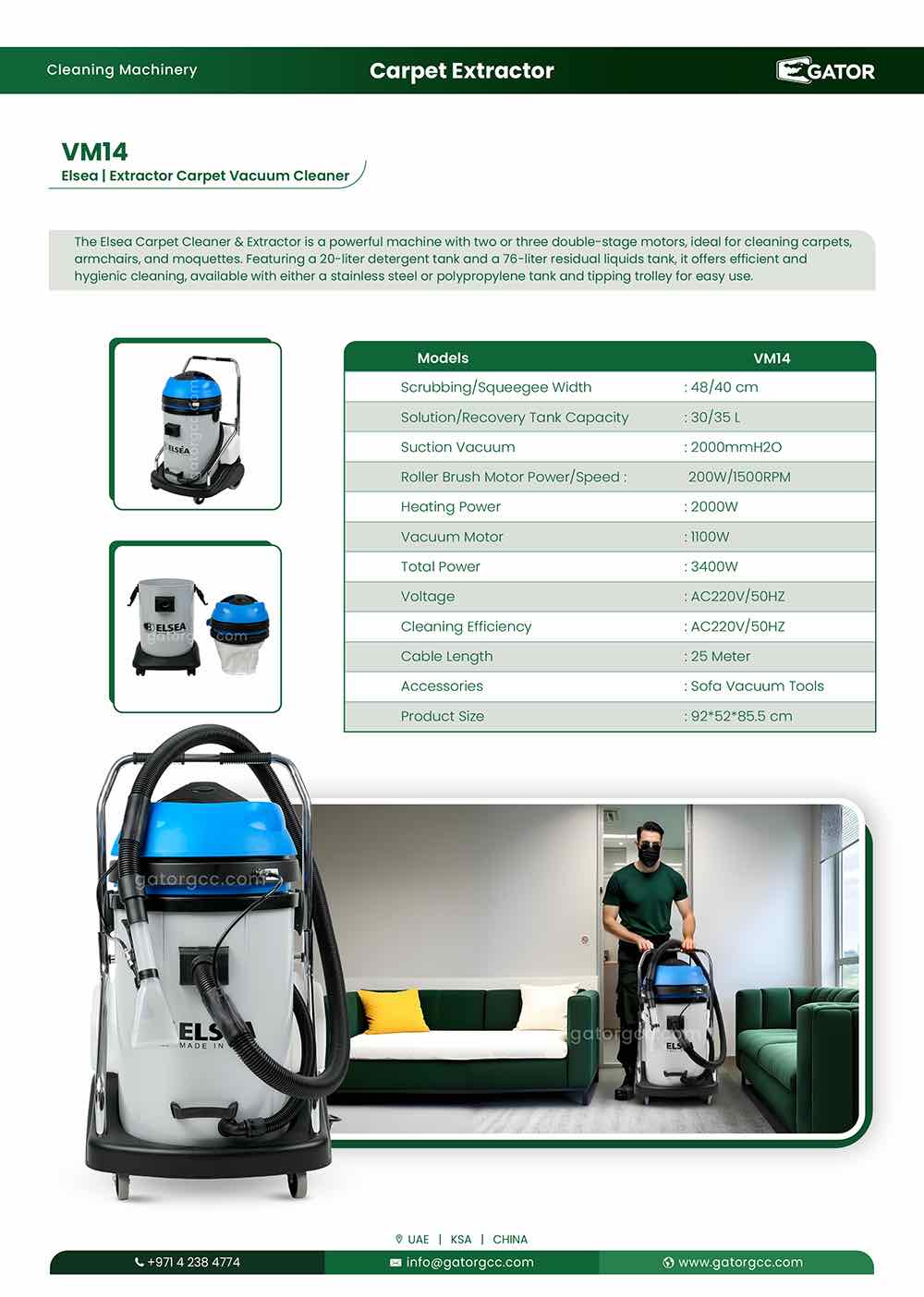The Elsea Estro 250 is a powerful carpet extractor and wet-dry vacuum cleaner, specifically designed for deep cleaning of carpets, upholstery, and armchairs. With its dual-motor system and high-capacity tanks, it provides strong suction, efficient detergent application, and easy waste disposal, making it an ideal choice for professional and industrial cleaning.