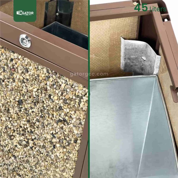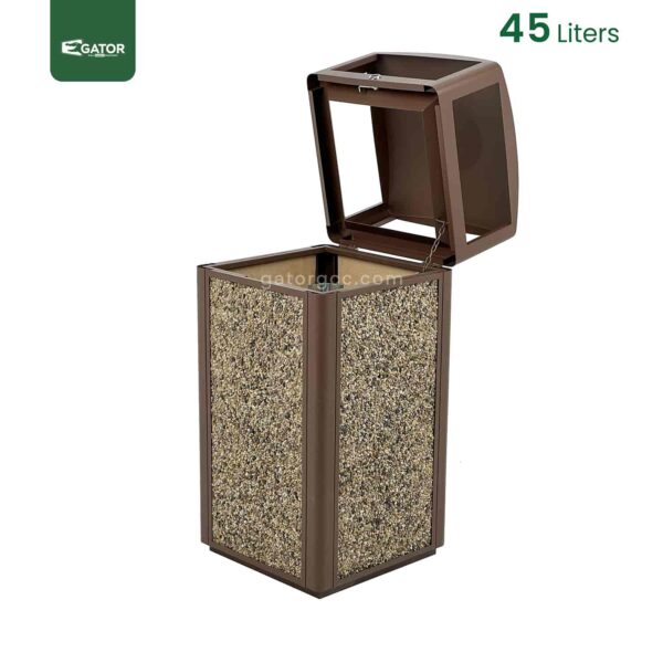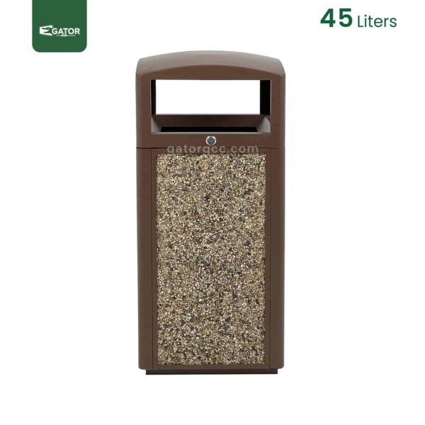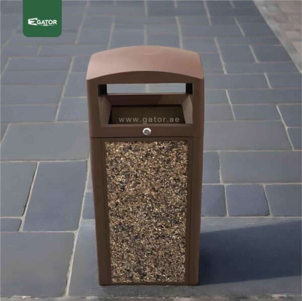 Professional-grade outdoor waste bin featuring elegant stone-textured panels and a modern design. Weather-resistant construction with a sleek top opening for easy waste disposal. Premium build quality ensures durability in high-traffic areas while maintaining an upscale appearance.