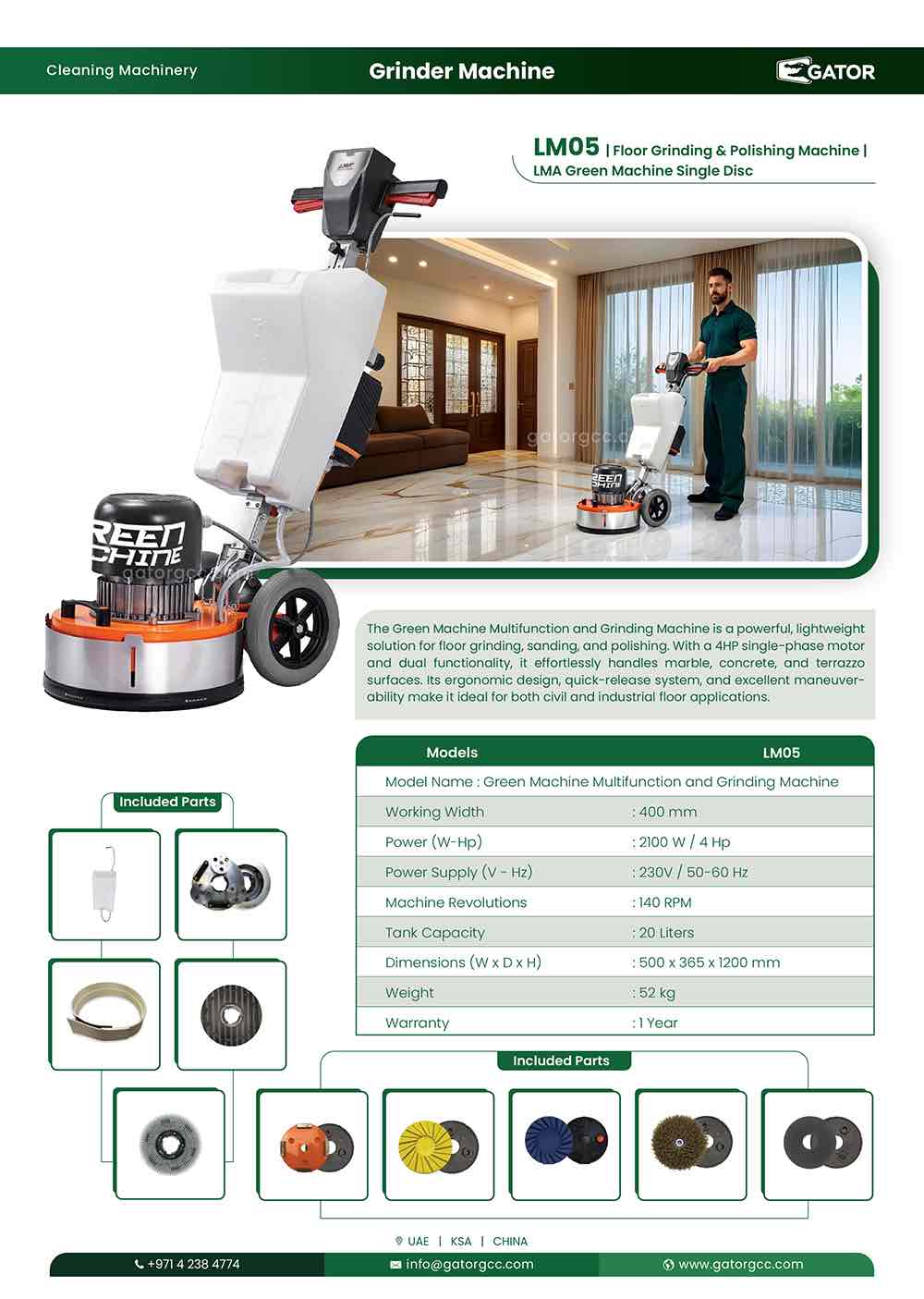 The Green Machine Multi function and Grinding Machine is a powerful and versatile solution designed for floor grinding, sanding, and polishing. With its 4HP single-phase motor, this lightweight yet robust machine is ideal for medium-sized, uneven floors, offering dual functionality that easily transforms from a sander to a single-disc machine. Whether you are working with marble, concrete, granite, terrazzo, or natural stone, the Green Machine guarantees smooth, professional results with minimal effort.