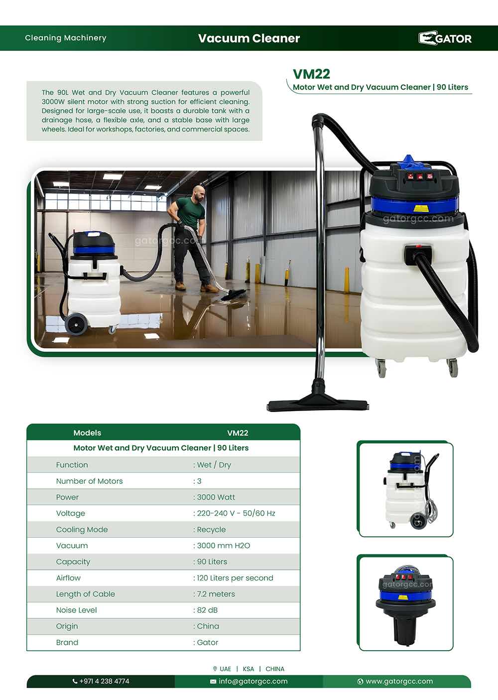 The GATOR Wet and Dry Vacuum Cleaner is built for tough cleaning tasks in demanding environments like workshops, factories, stores, and industrial sites. Powered by a 3000W motor, this machine provides exceptional suction power to handle both wet and dry cleaning efficiently. With a 90L capacity tank, it offers extended cleaning sessions without the need for constant emptying, making it perfect for large-scale, high-volume tasks.