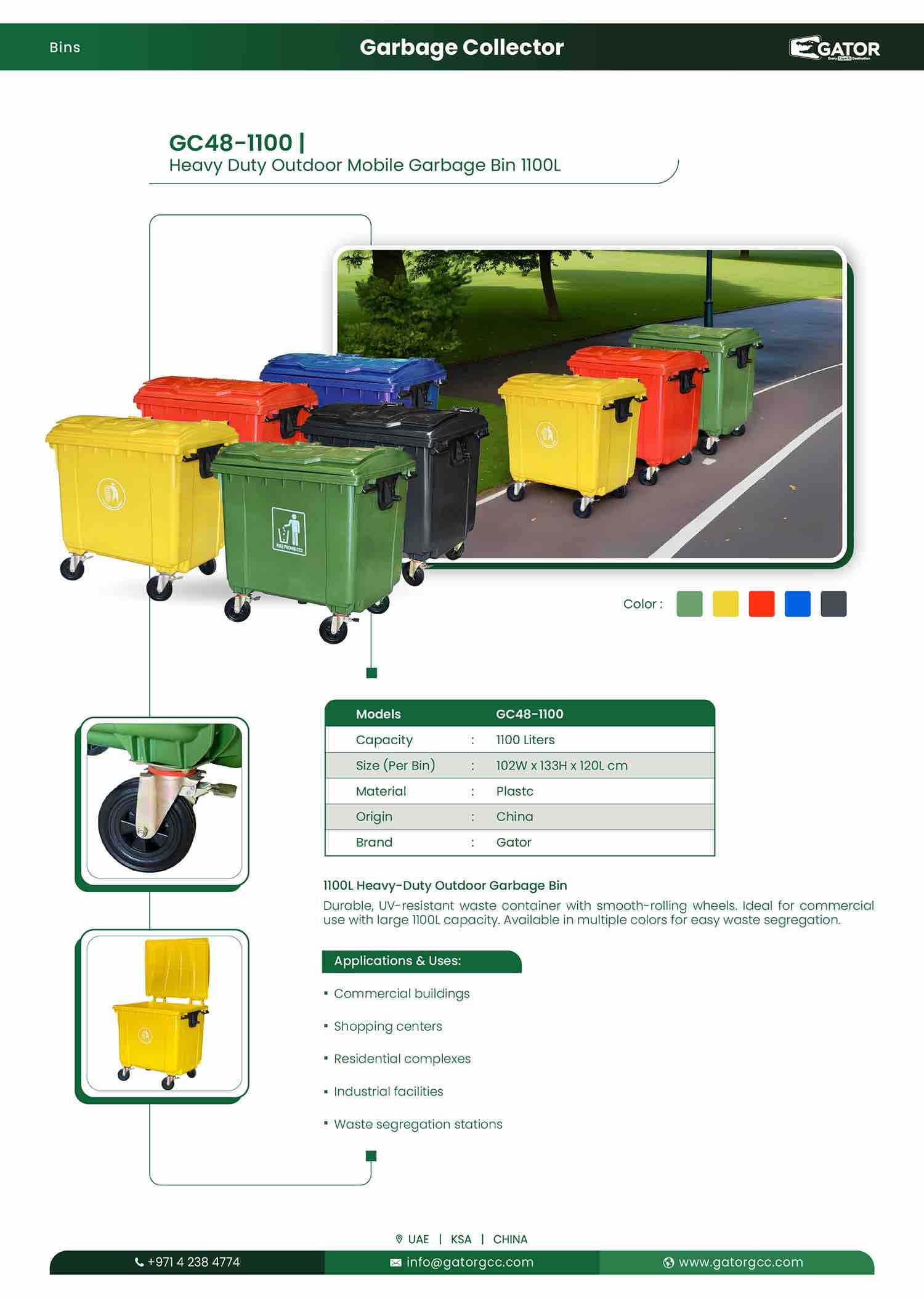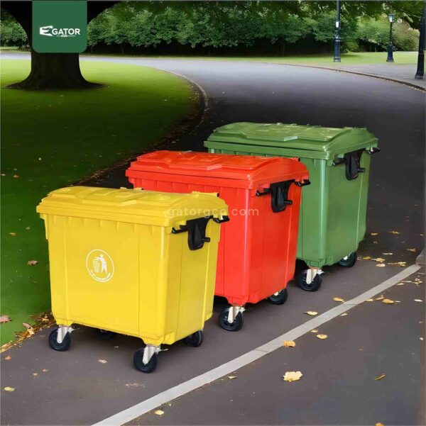 Its UV-resistant plastic body withstands harsh weather conditions, while four smooth-rolling heavy-duty casters ensure easy mobility, even when fully loaded. Available in multiple color options, it also supports waste segregation in line with sustainability standards.