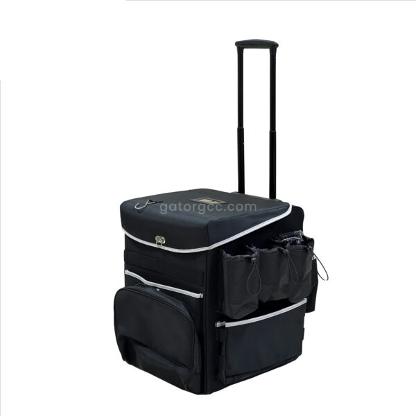 The bag features strong wheels, a stable base, and multiple side and rear storage areas that allow easy access to bottles, tools, and documents.
