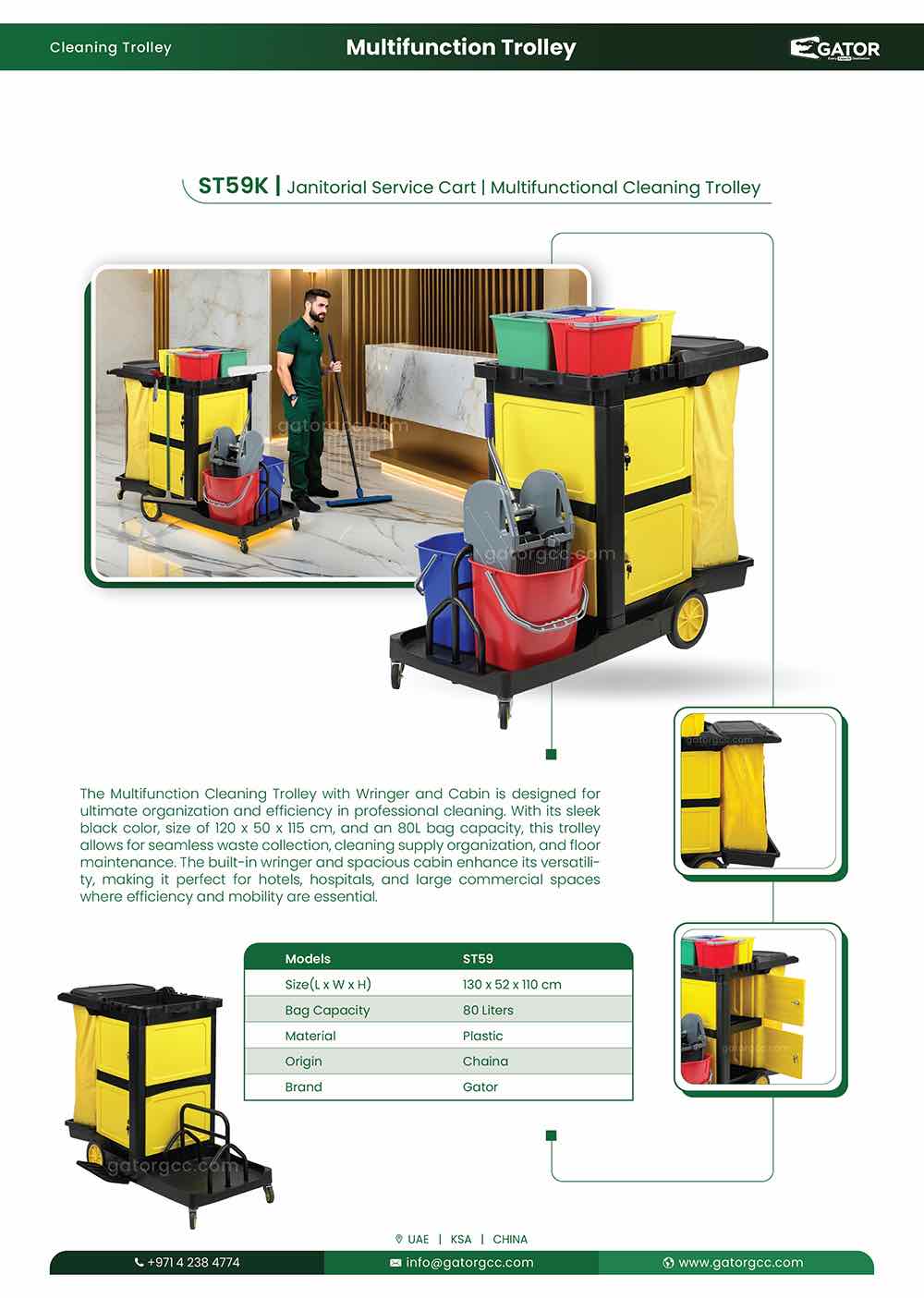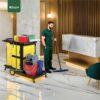 The Multifunction Cleaning Trolley with Wringer and Cabin is designed for ultimate organization and efficiency in professional cleaning. With its sleek black color, size of 120 x 50 x 115 cm, and an 80L bag capacity, this trolley allows for seamless waste collection, cleaning supply organization, and floor maintenance. The built-in wringer and spacious cabin enhance its versatility, making it perfect for hotels, hospitals, and large commercial spaces where efficiency and mobility are essential.