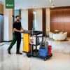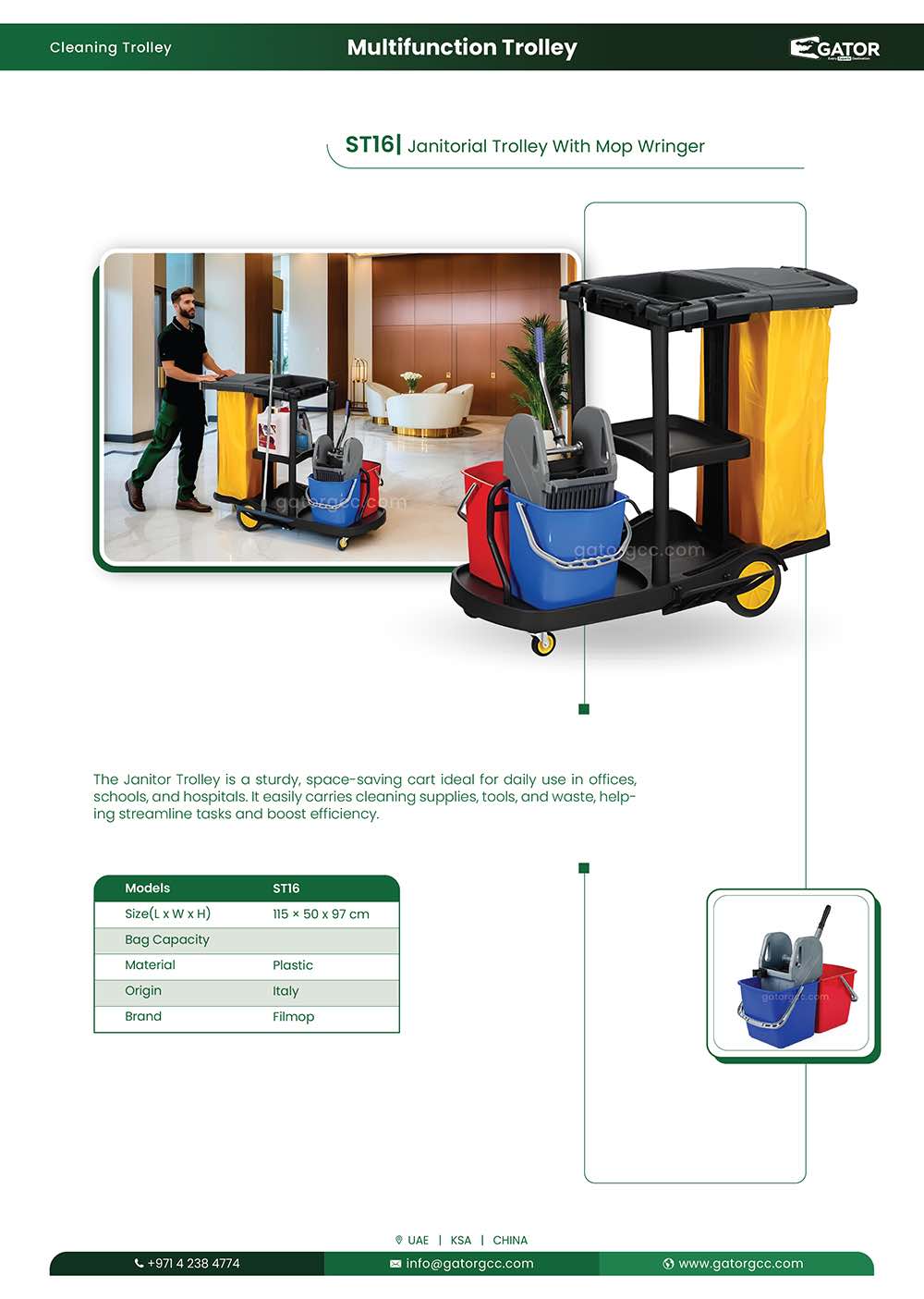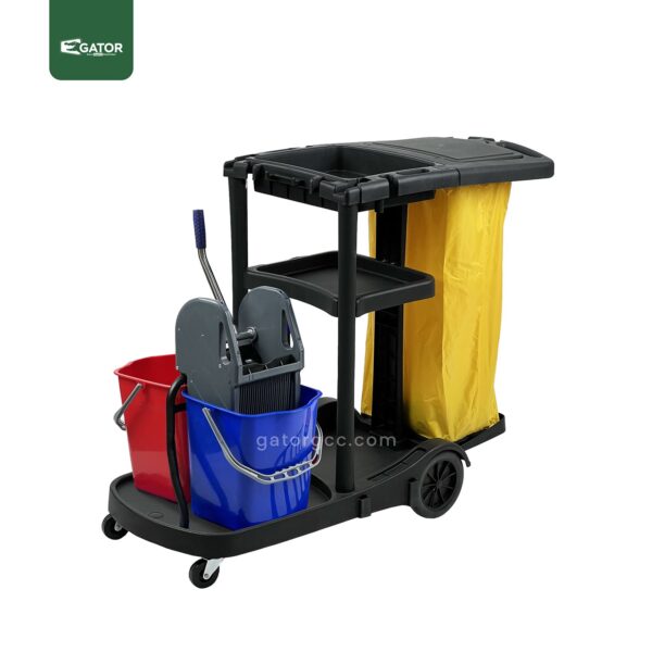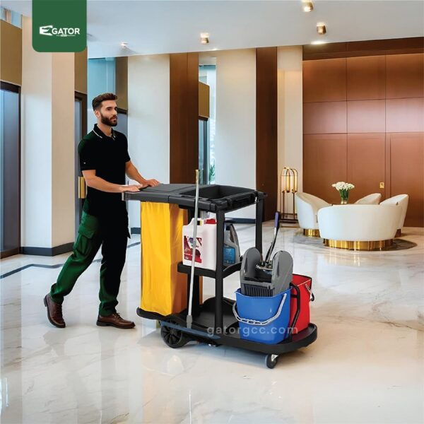The Janitor Trolley, with dimensions of 115 x 50 x 97 cm, is perfect for carrying cleaning supplies, tools, and waste with ease. Designed for daily use, its sturdy structure ensures it can withstand the demands of busy environments like offices, schools, and hospitals. With its easy-to-maneuver design, this trolley helps streamline your cleaning tasks, keeping everything organized and within reach, while boosting efficiency. A reliable, practical solution for any cleaning team in need of a dependable and space-saving trolley.