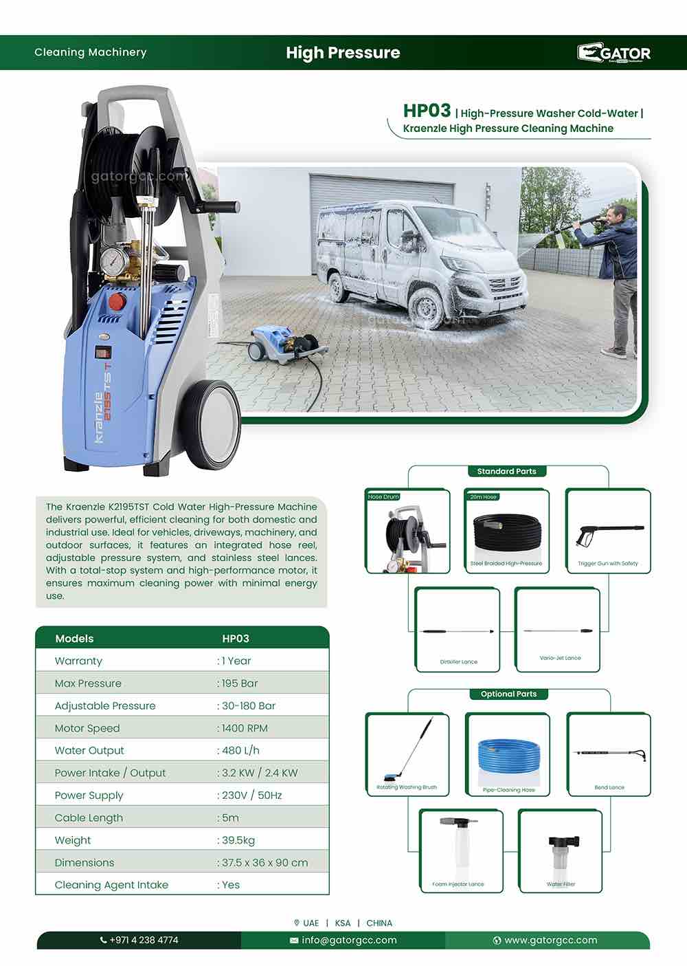 - Integrated Hose Reel: Ensures easy storage and handling of the high-pressure hose.