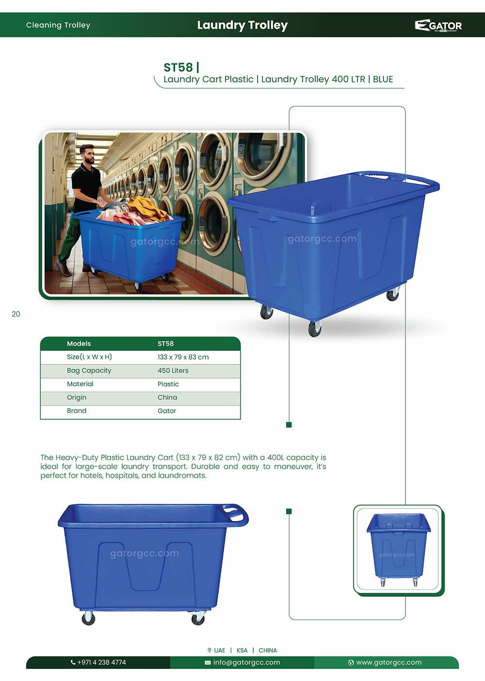 The Heavy-Duty Plastic Laundry Cart is built for maximum capacity and durability, making it the perfect solution for large-scale laundry transportation. With a spacious size of 133 x 79 x 82 cm and a massive 400L capacity, it effortlessly handles heavy loads, ideal for hotels, hospitals, and laundromats. The sturdy plastic construction ensures long-term durability, while its ergonomic design allows for smooth maneuverability. Whether for commercial or industrial use, this cart is a reliable and efficient laundry-handling solution.