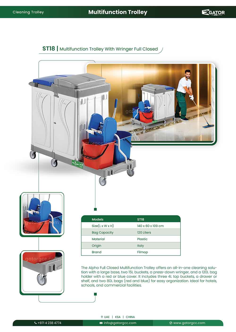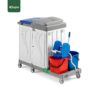 The Alpha Full Closed Multifunction Trolley is designed to provide all-in-one solutions for cleaning and maintenance tasks. With a large base, it comes equipped with two 15L buckets and a press-down wringer for efficient mop wringing. The trolley includes a choice of blue or red plastic cover for the 120L bag holder, along with three 4-liter top buckets, a drawer or shelf for storage, and two 80L plastic bags (red and blue). This complete setup offers easy organization and enhances productivity, making it perfect for high-demand environments like hotels, schools, and commercial facilities