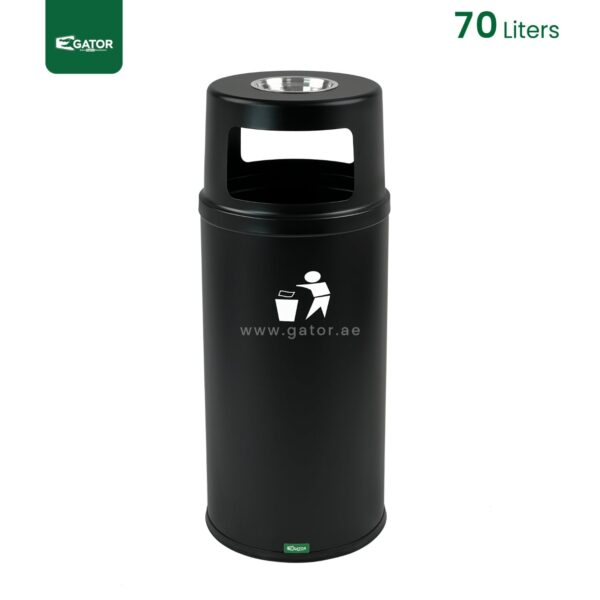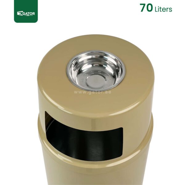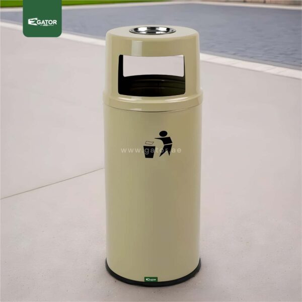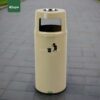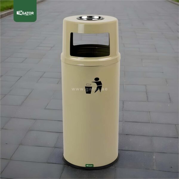 Professional-grade cylindrical waste bin with integrated ashtray top section. Features a durable painted finish and contemporary design. Large capacity, ideal for high-traffic areas, with convenient waste disposal and dedicated cigarette collection.