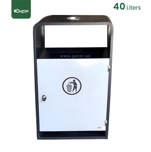 Contemporary outdoor waste bin featuring clean lines and minimalist design. White front panel with clear iconography for intuitive use. Durable construction with integrated ashtray top for proper cigarette disposal. Perfect blend of functionality and modern aesthetics.