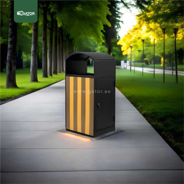 Sophisticated outdoor waste bin featuring vertical wood-effect panels and domed top design. Built with galvanized inner container for enhanced durability and easy maintenance. Modern aesthetic with practical functionality suitable for various outdoor environments.
