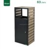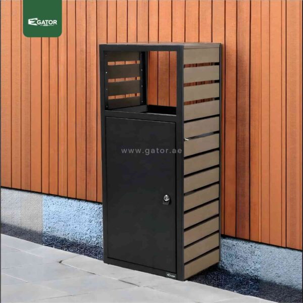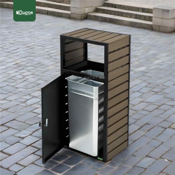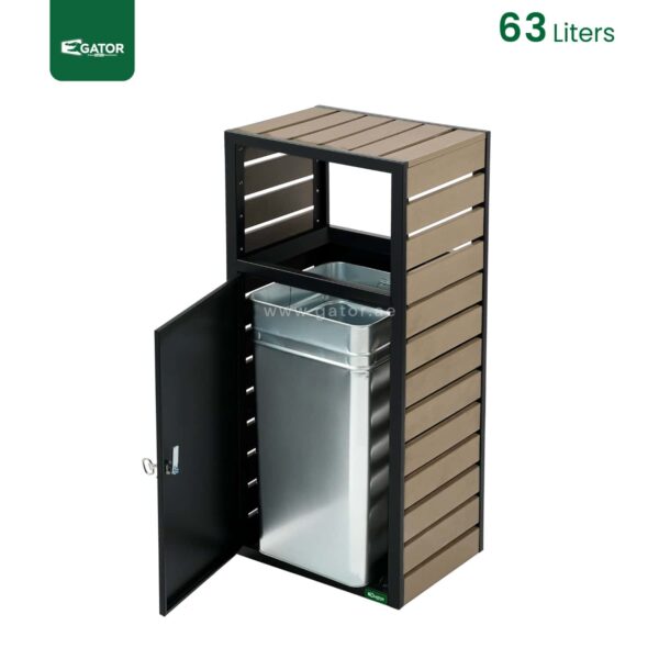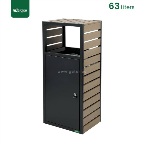 High-capacity outdoor waste bin with durable wood-effect panels and robust construction. Features a galvanized inner container for easy cleaning and maintenance. Secure front-access door with lock system ensures controlled waste management.