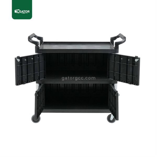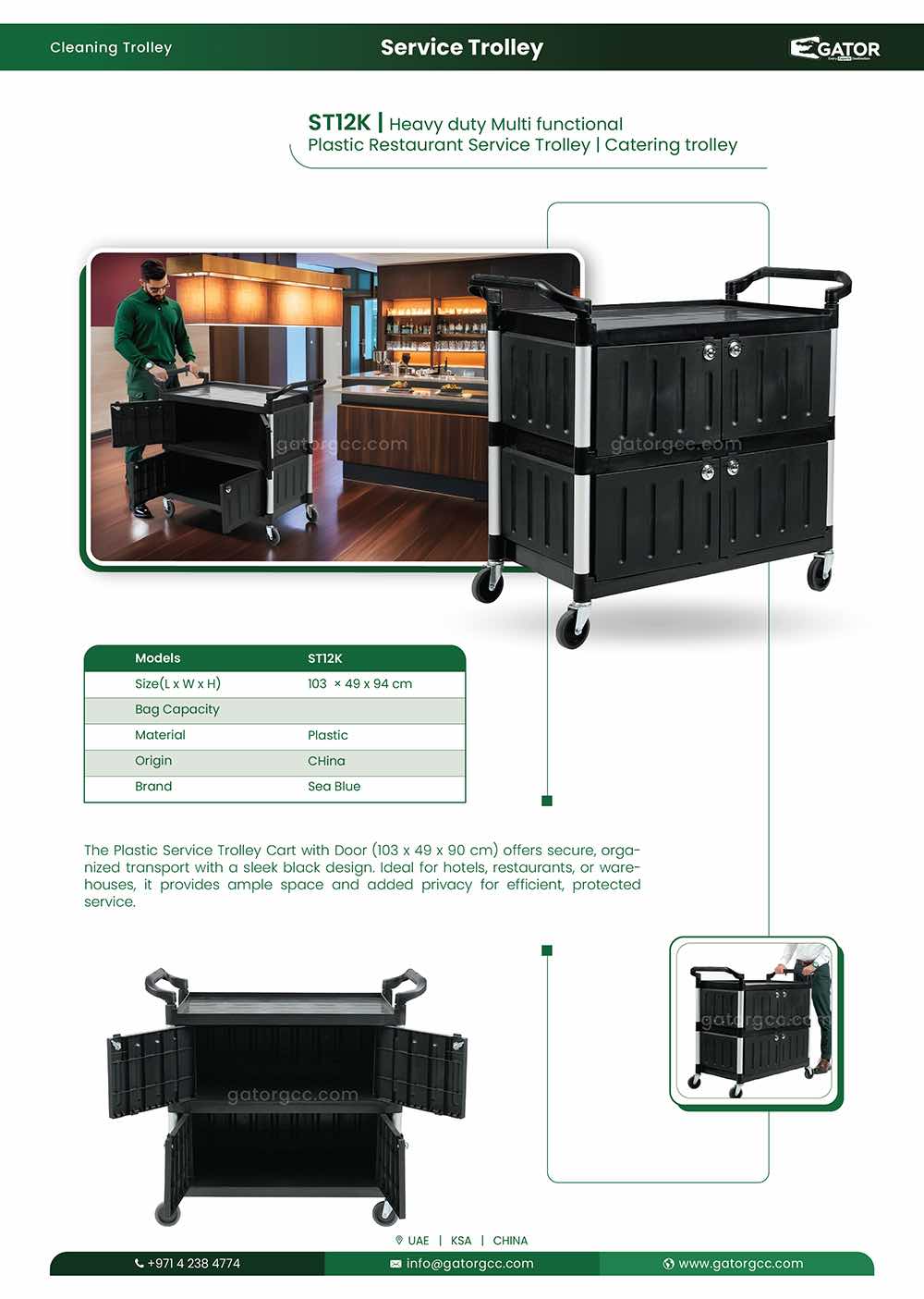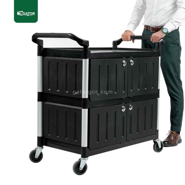 The Plastic Service Trolley Cart with a door is designed for easy organization and secure transport. With its sleek Black color, it offers a professional look while ensuring practicality. The generous size of 103 L * 49 W * 90 H provides ample space for storing and moving goods. Ideal for use in hotels, restaurants, or warehouses, this trolley features a door for added privacy and security, allowing you to transport items efficiently while keeping them covered and protected.
