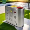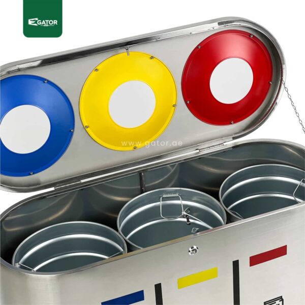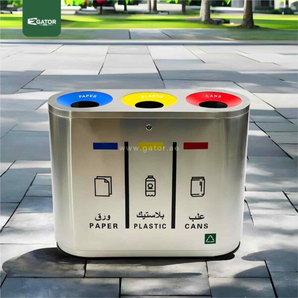 Enhance your waste management system with this stainless steel, 3-compartment recycling bin, designed for efficient waste sorting in commercial and public areas. With a 180L total capacity, this high-quality garbage bin is perfect for malls, parks, hotels, offices, schools, and streets in Dubai, Abu Dhabi, Riyadh, and Jeddah.