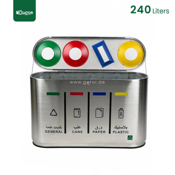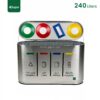 Each recycling station includes four 60-liter compartments, offering a total capacity of 240L. The durable stainless steel construction measures 36w × 76 h × 120 l perfect for high-traffic areas.