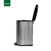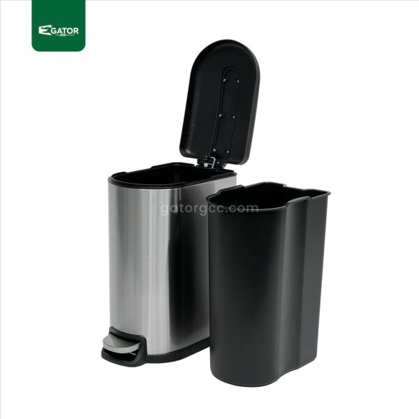 Its wide, easy-press pedal gives you hands-free convenience, while the soft-close lid ensures quiet, odor-free operation. The matte silver stainless steel body resists fingerprints, and the bold black plastic lid with a stainless steel accent strip adds a modern touch to any space. A removable inner bucket makes emptying quick and hygienic, and the rear handle and non-slip rubber base ensure safety and mobility.